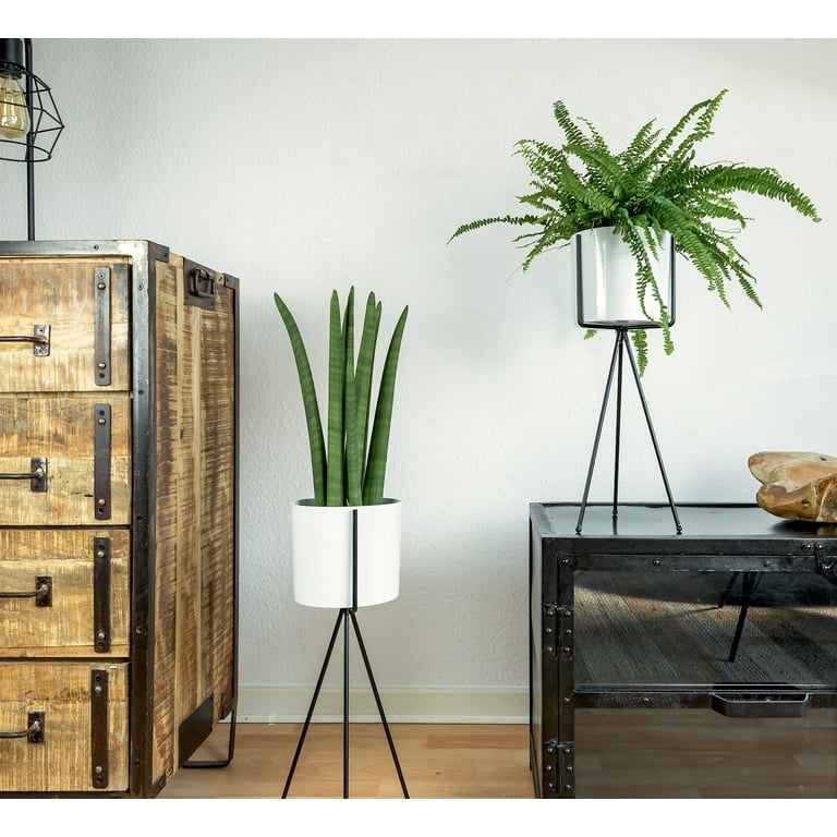 Set Of 2 Modern White Planter With Metal Plant Stand 7 Inch Large Pot With Black Mid Century Stands Flower Pot Decor For Orchid Aloe Big Cactus 18 And 24 Inch Tall